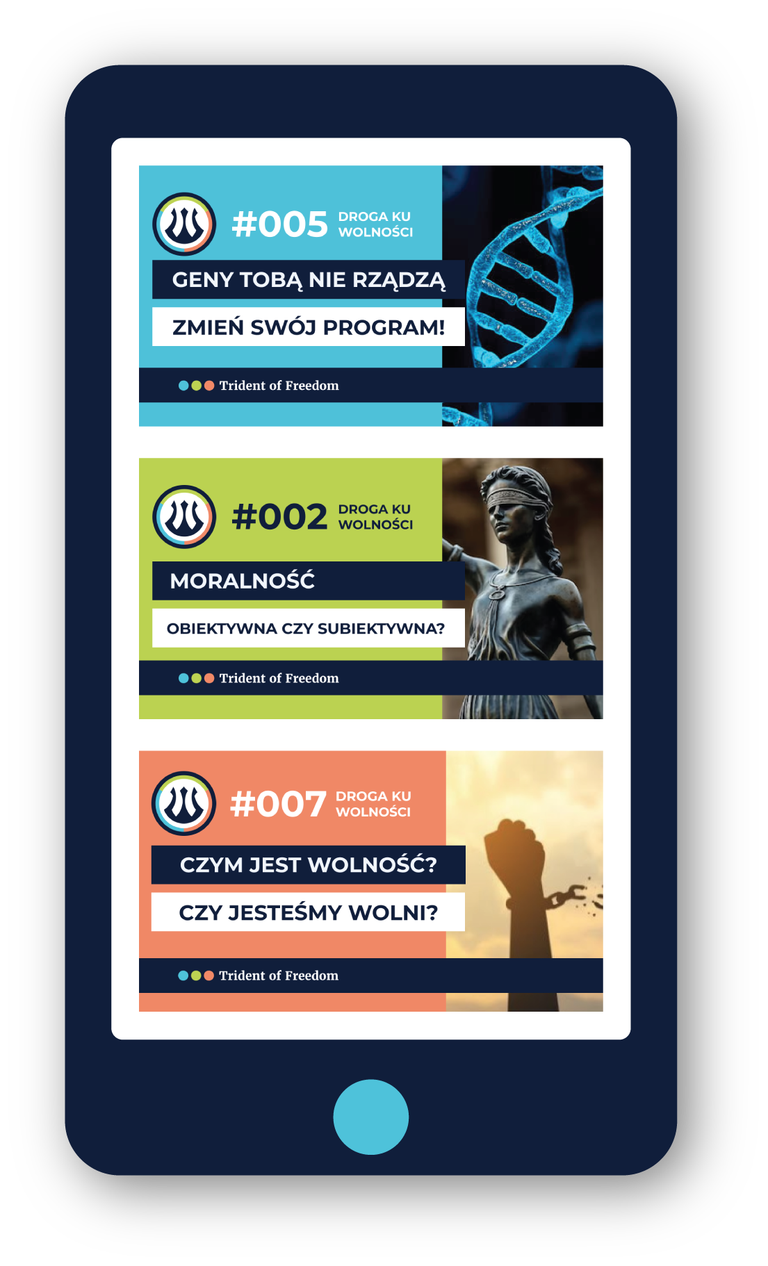 Projekt identyfikacji wizualnej dla Trident of Freedom powstał na bazie precyzyjnie opisanej idei – wolności jako działania opartego na trzech filarach: wiedza → prawda → akcja.