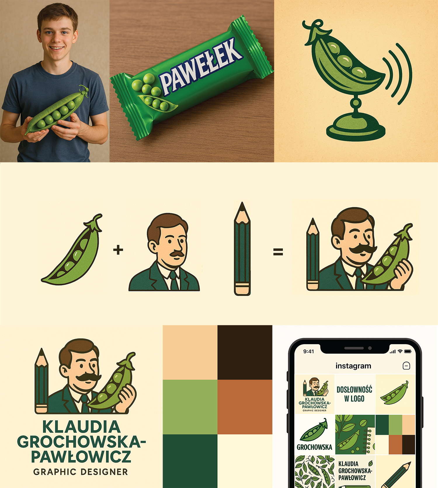 Nazywam się Grochowska-Pawłowicz. Gdyby moje logo miało to dosłownie oddać, to co? Groszek i Pawełek? Jak Pawełek to baton czy osoba o imieniu Paweł? Batonik jest prawnie chroniony, więc weźmy drugą opcję 😉 chociaż możemy też nawiązać do psa Pawłowa…