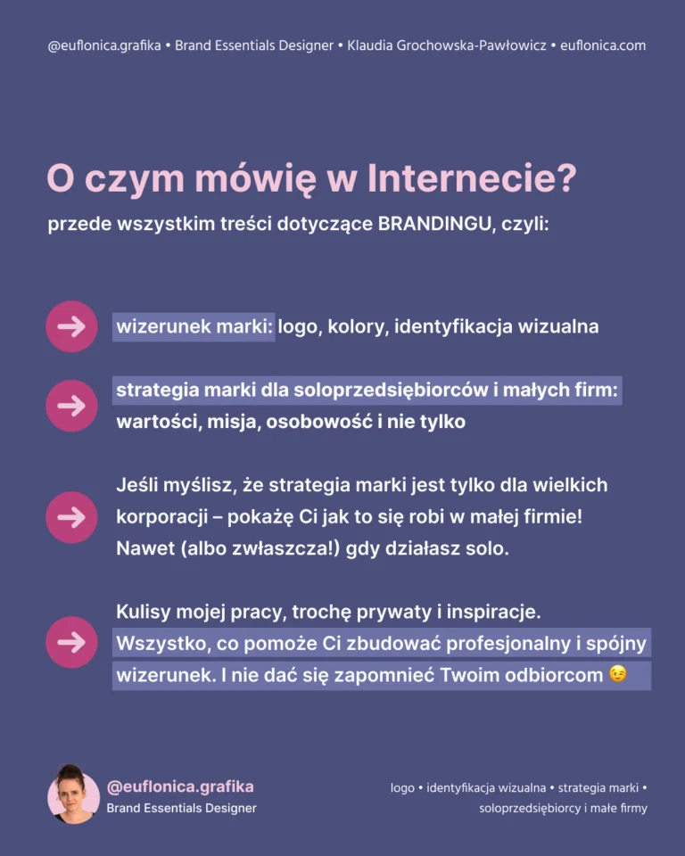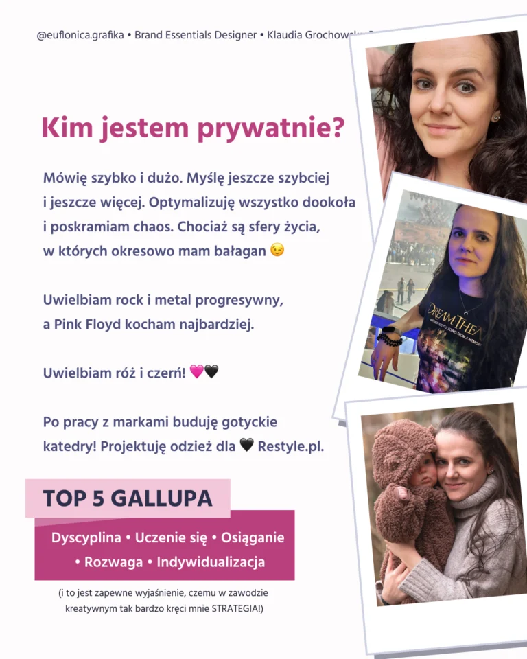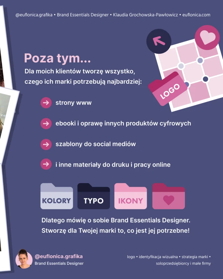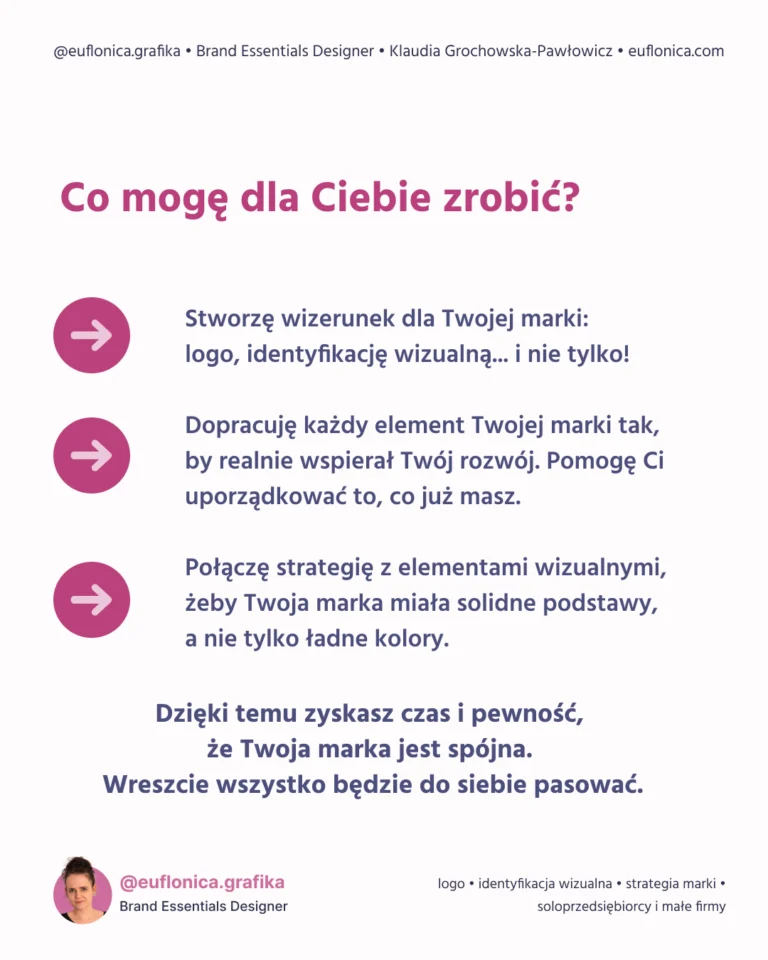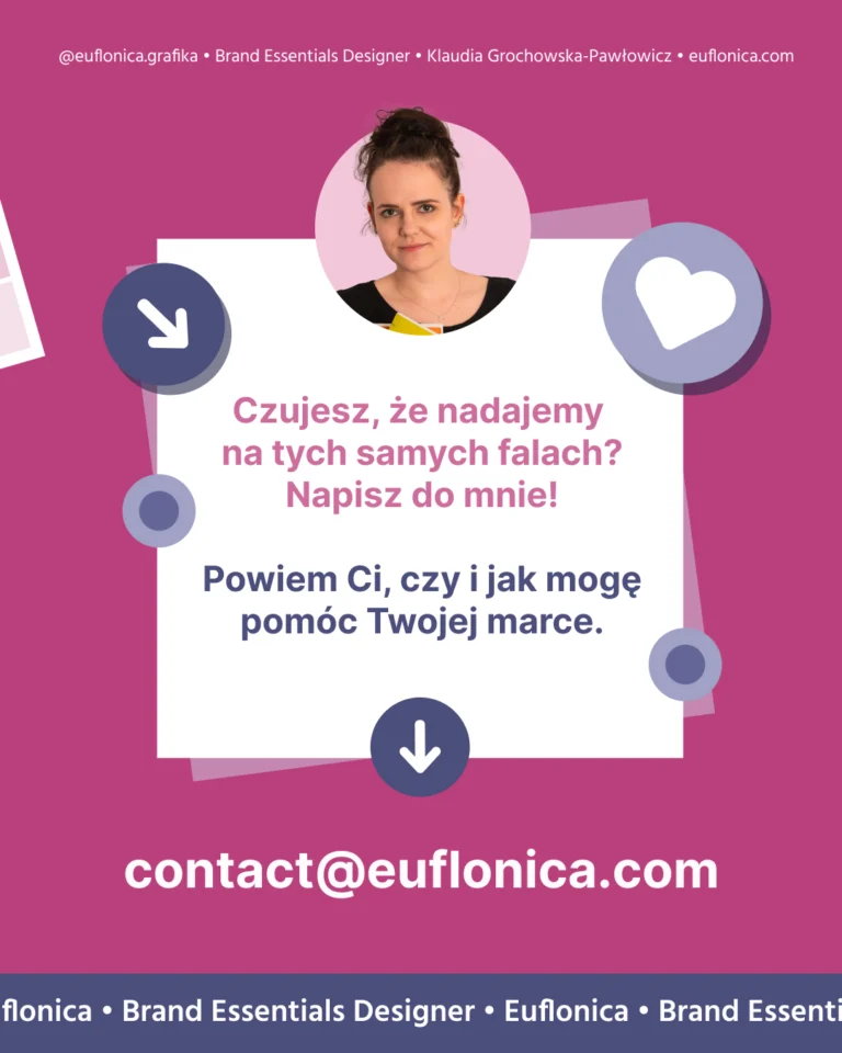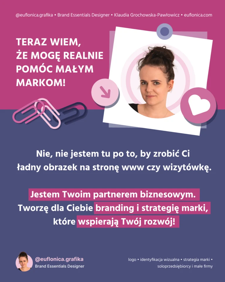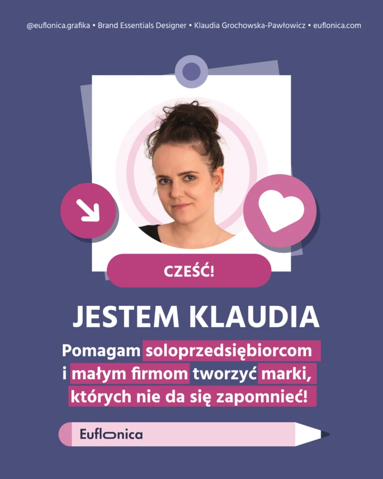 Mam na imię Klaudia i od ponad 15 lat działam w branży graficznej. Zajmuję się brandingiem i strategią marki – zaczynam od wydobycia jej prawdziwej esencji, a kończę na tym, że pomagam stworzyć markę, której po prostu nie da się zapomnieć.