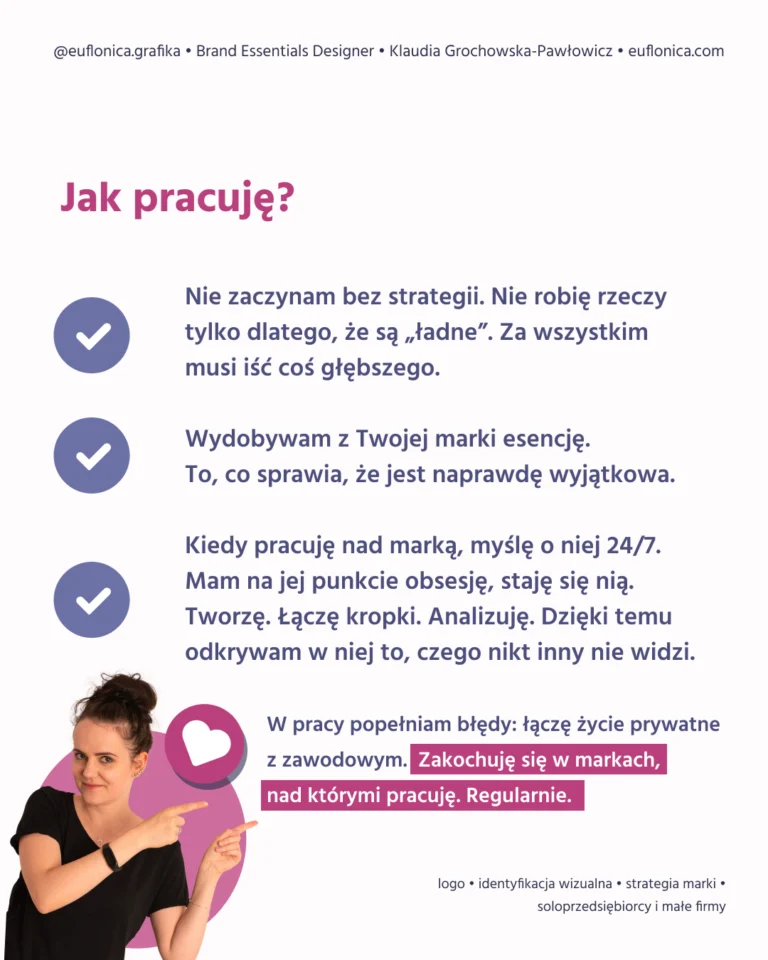Łączę kropki, których inni nie widzą. Zadaję pytania, które zmieniają Twój sposób patrzenia na markę. Tworzę przestrzeń do transformacji – tej wizualnej i tej wewnętrznej. Klienci sami są często zaskoczeni tym, co odkrywają w swojej marce, którą często prowadzą latami. To wszystko już w Tobie jest. Ja tylko pomagam Ci to odkryć i pokazać światu.