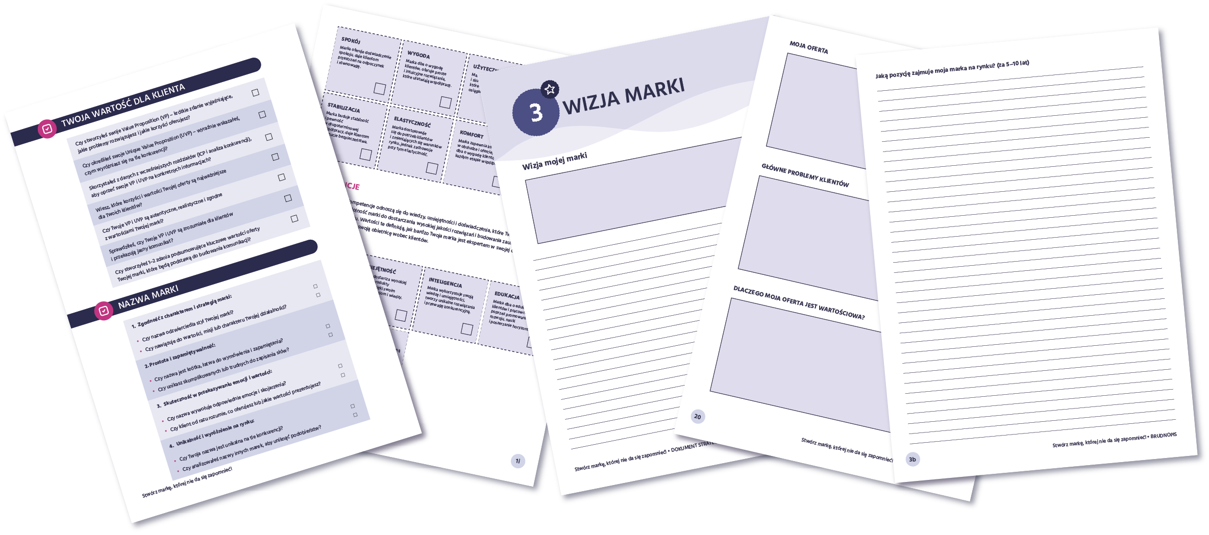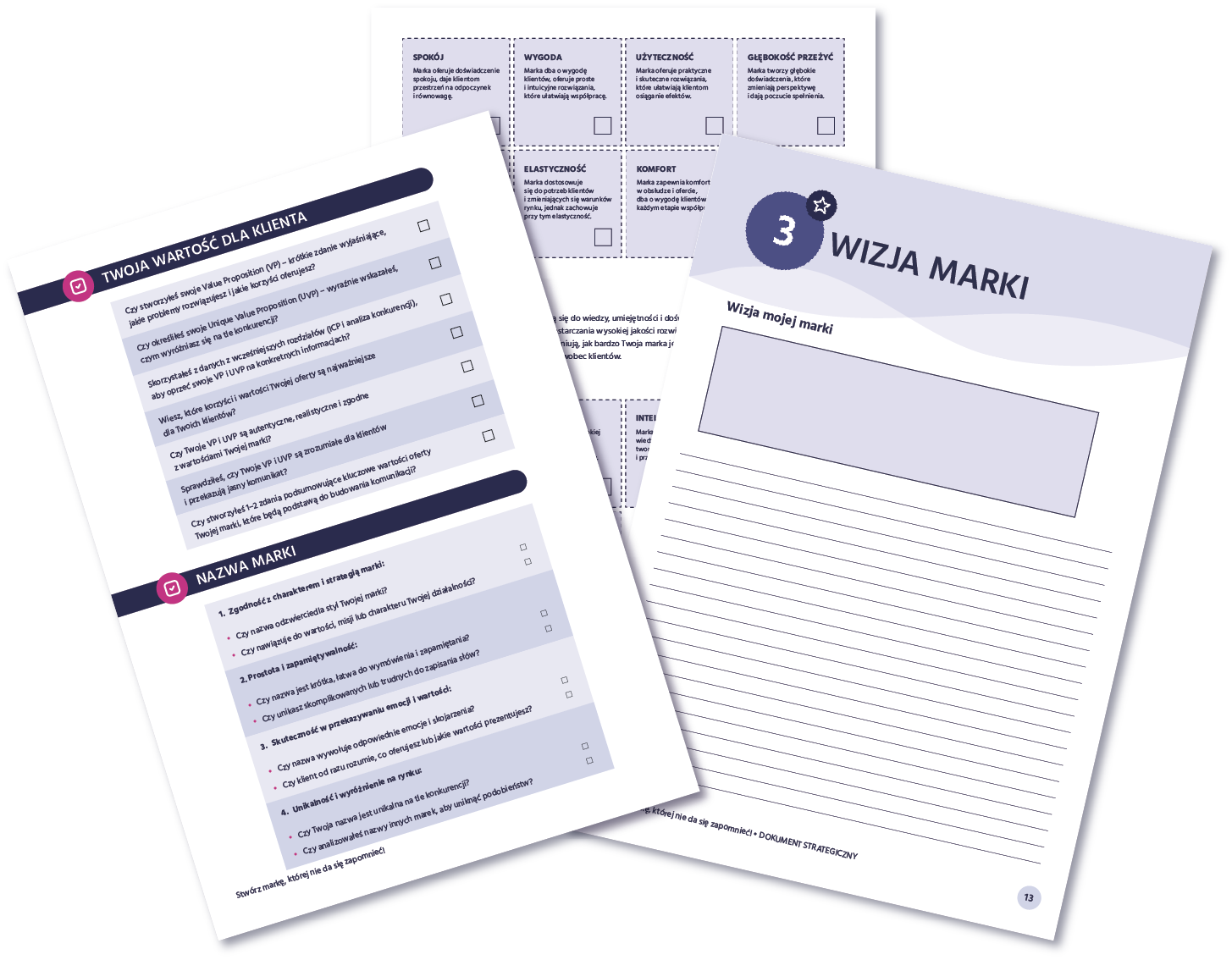 Karty pracy – czyli część praktyczna, gdzie zapisujesz wyniki swojej pracy. To Twoja strategia marki zebrana w jednym miejscu – możesz do niej wracać, kiedy tylko chcesz.